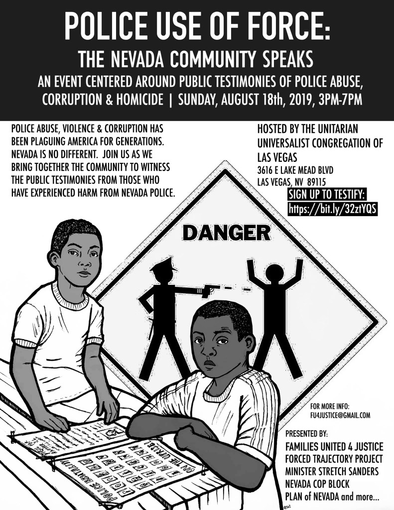 In direct response to the Las Vegas Metropolitan Police’s Use of Force panel hosted at the Mob Museum back in July 2018 where they claimed to be the national model for police reform, Families United 4 Justice in collaboration with Forced Trajectory Project, Unitarian Universalist Congregation of Las Vegas, Nevada Cop Block, ACAB Radio, Minister Stretch Sanders, PLAN Action Fund, Mass Liberation Project, and others, will be hosting a 1/2 day of public testimonies from the Nevada community, on what they have experienced in regards to police abuse, brutality, violence, corruption and homicide.